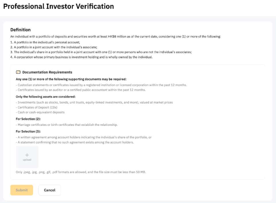 最後,您需要上傳相關證明文件,以驗證您身為專業投資人的地位。