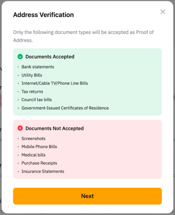 地址證明必須在過去三 (3) 個月內核發。超過三個月的文件將被拒絕。