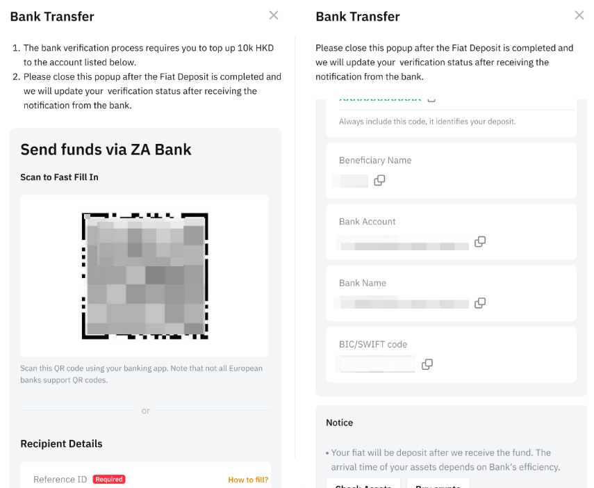 完成上述驗證步驟後,您可以繼續 Fiat Deposit。為使驗證成功,請僅從以您的姓名註冊且與您的 ID 驗證相符的香港銀行帳戶(即香港國際銀行授權的銀行)存入資金。  請注意,不接受來自非香港銀行帳戶的 Fiat 存款。