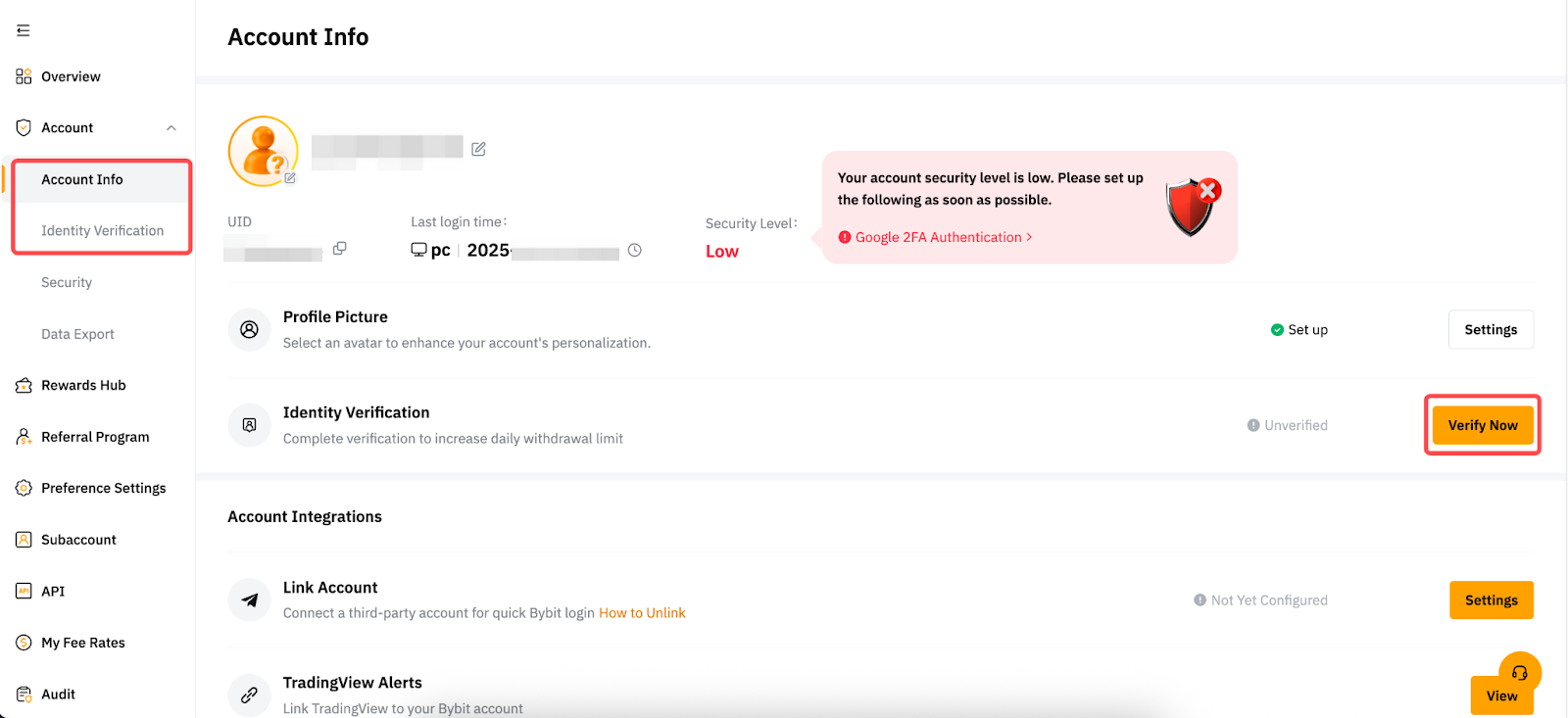 步驟 2:按一下帳戶資訊下方的身分驗證欄中的立即驗證以進入身分驗證頁面,或直接按一下身分驗證以進入頁面。