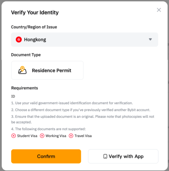 選擇香港作為您的簽發國家/地區及您的身份文件類型。然後,按一下確認以繼續。