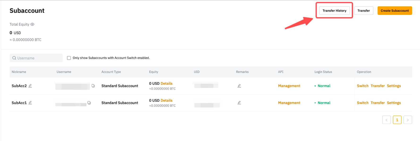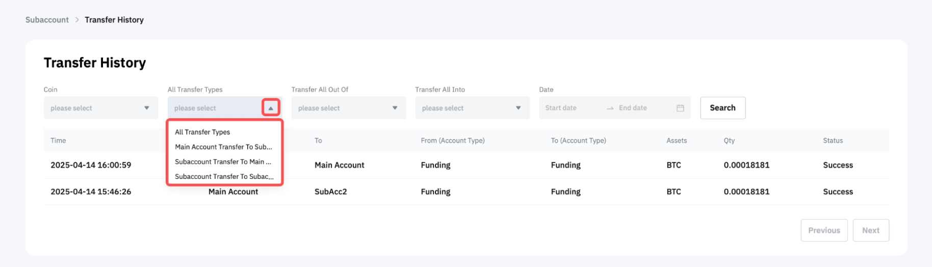 在轉帳歷史記錄頁面上,您可以選擇您希望更準確地查看的轉帳類型,例如從主帳戶轉帳至子帳戶、從子帳戶轉帳至主帳戶或兩個子帳戶。