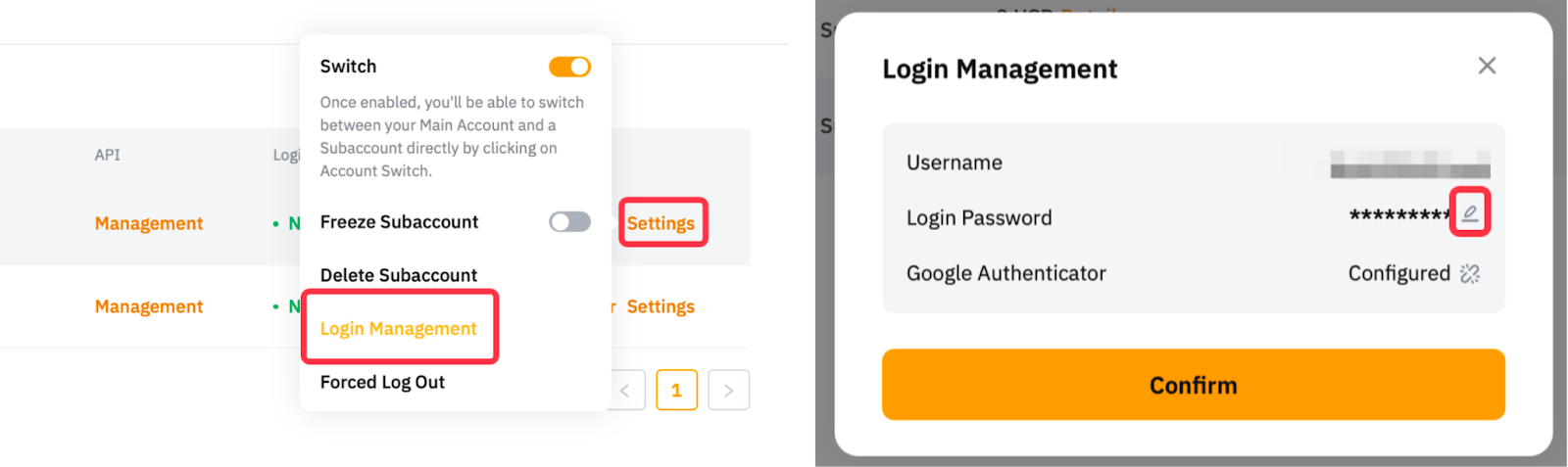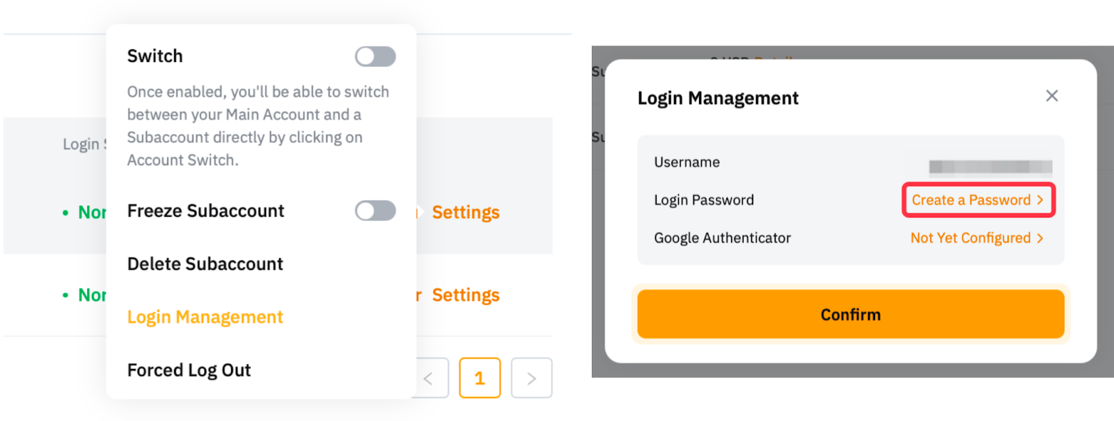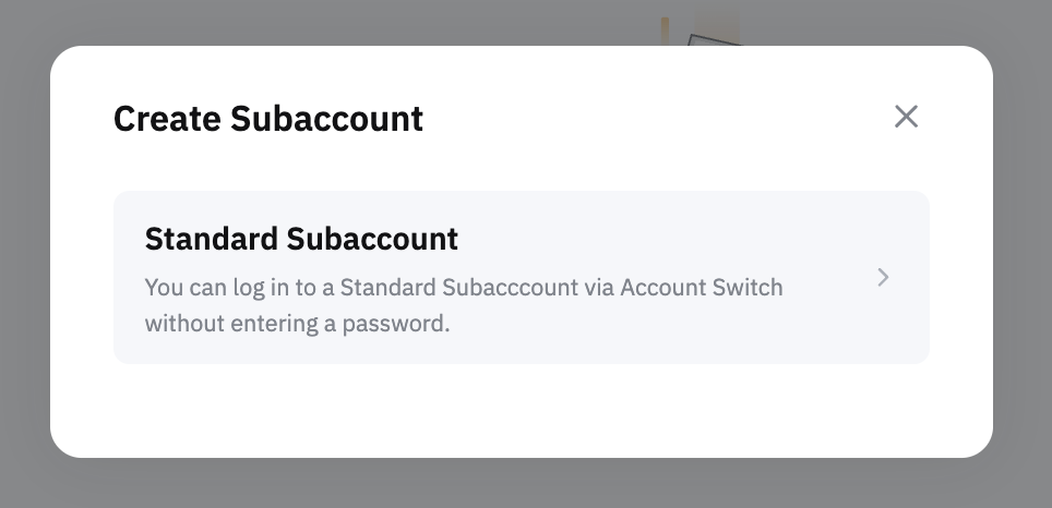 請注意,如果您最初建立的標準子帳戶時沒有任何密碼設置,則無法透過此頁面登入.您只能透過主帳戶的帳戶切換登入.若要透過 ByHKbit 登入頁面啟動登入,請連接至您的主帳戶,然後在子帳戶頁面找到子帳戶,然後點擊更多 → 設定 → 登入管理。現在您可以找回子帳戶用戶名,點擊建立密碼設定新密碼。