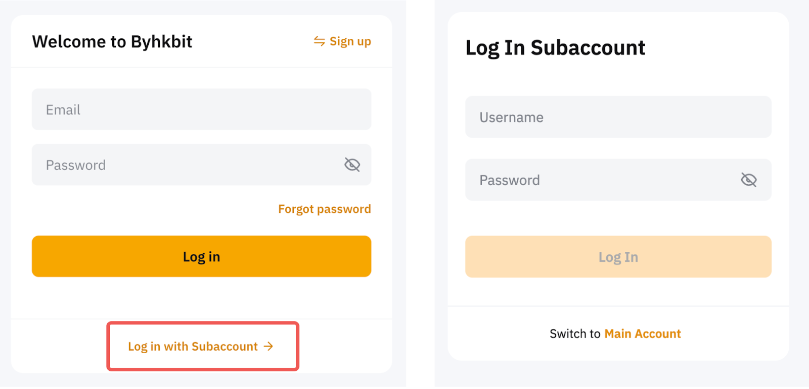 — 使用您的 ByHKbit 使用者名稱和密碼透過登入頁面登入子帳戶。在這種情況下,僅支援轉帳回主帳戶或相同子帳戶。