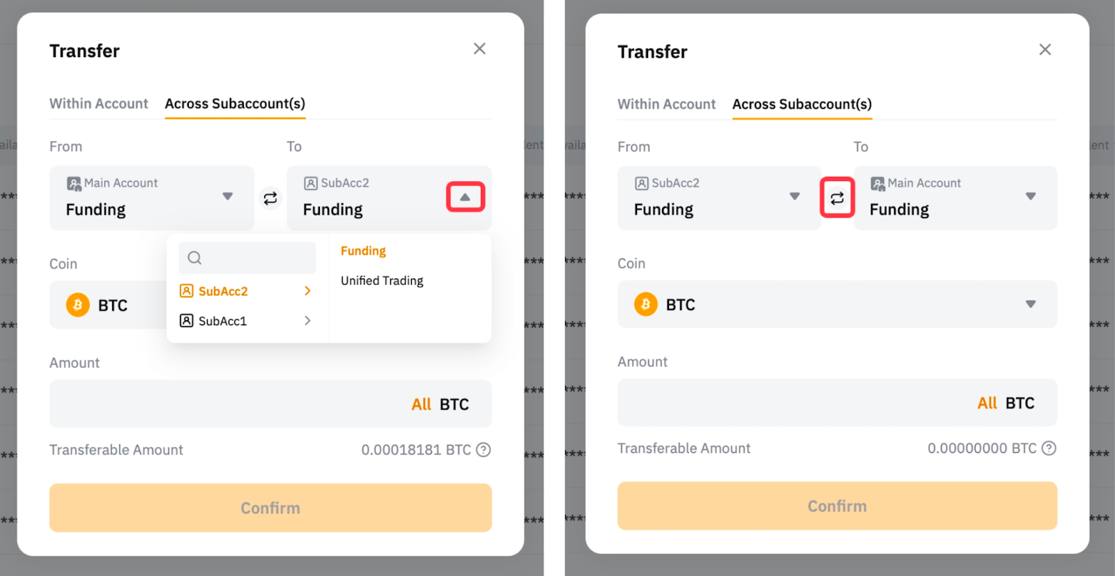 在轉帳視窗中,切換至子帳戶劃轉選項卡,在主帳戶和子帳戶之間劃轉資金。您也可以點選切換圖示選擇轉帳方向。