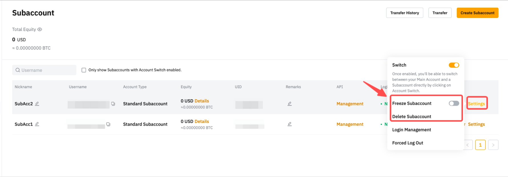 若要刪除/凍結子帳戶,請在主帳戶中點選對應子帳戶的設定。凍結或刪除子帳戶後,系統將不再支援使用該子帳戶進行登入和 API 管理。