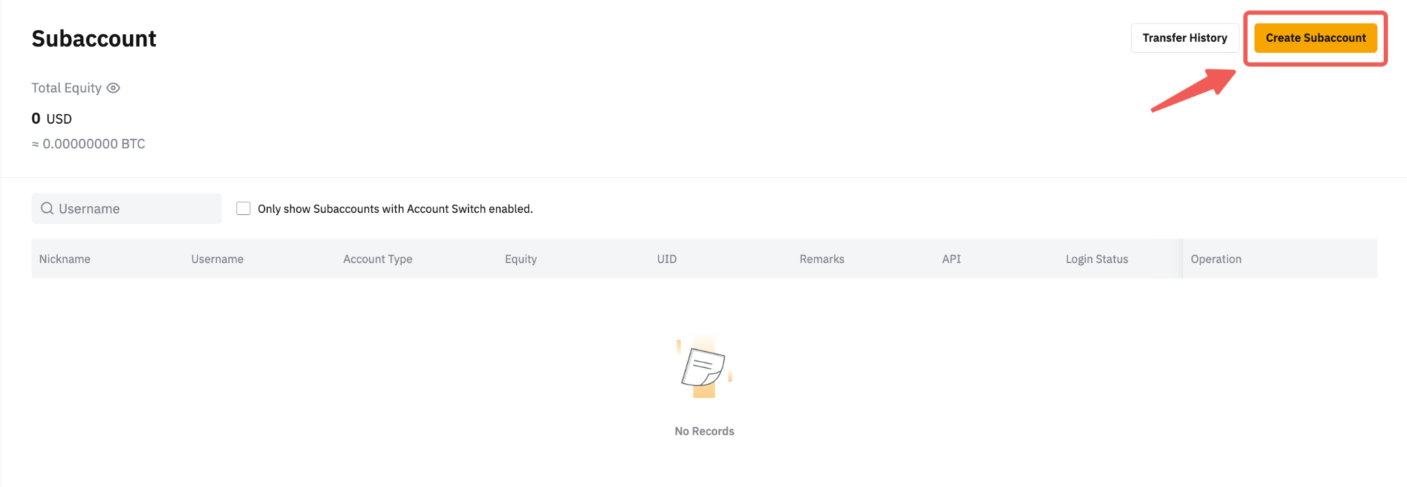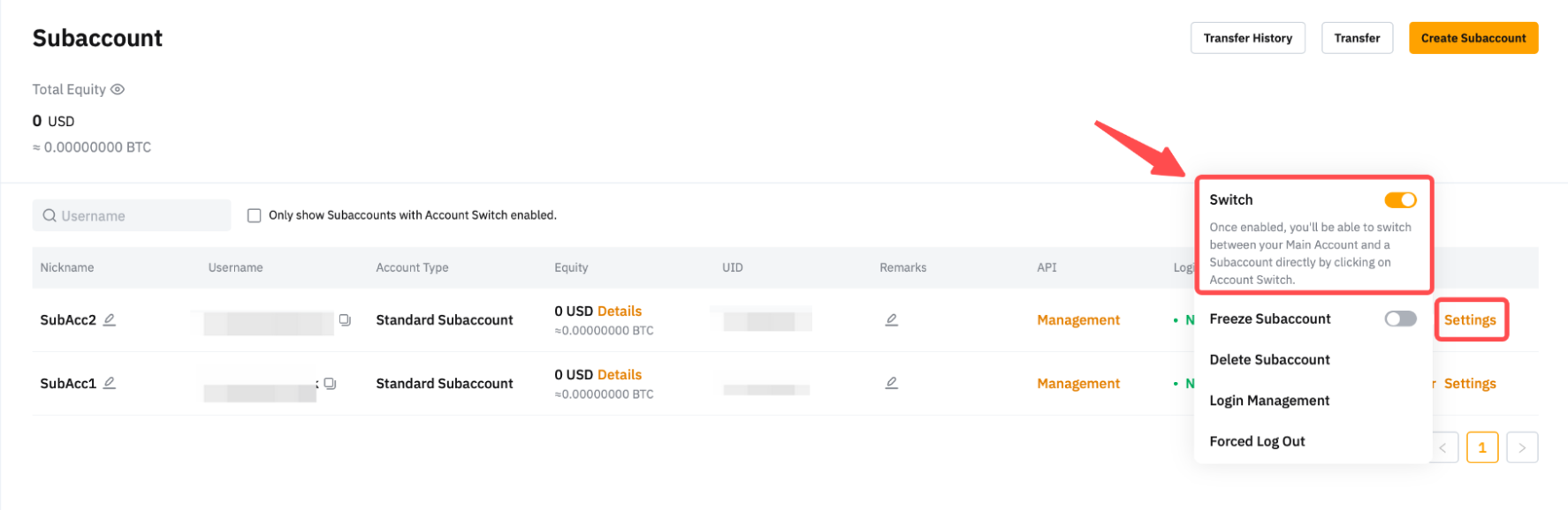 如果您無法找到某個子帳戶,則該子帳戶可能無法啟用帳戶切換功能。要激活,請登入您的主帳戶,前往子帳號頁面,點選對應子帳戶的設定,啟用/停用該子帳戶的帳戶切換功能。