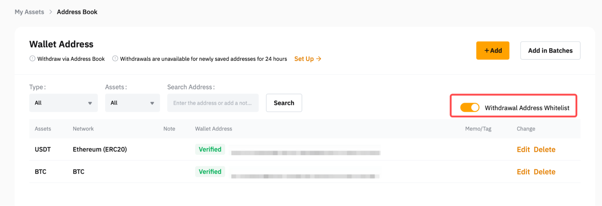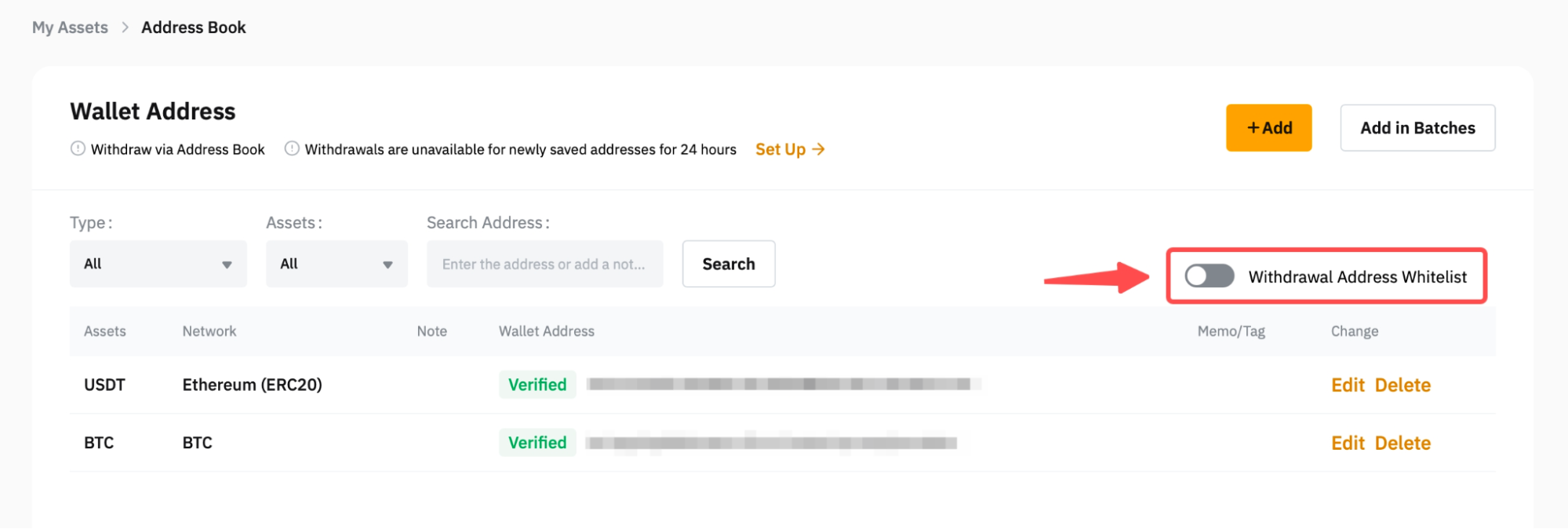 第 5 步: 驗證完錢包地址後,請激活頁面右上角的提款地址白名單功能,以便在您的提款功能中將已驗證的錢包地址列入白名單。