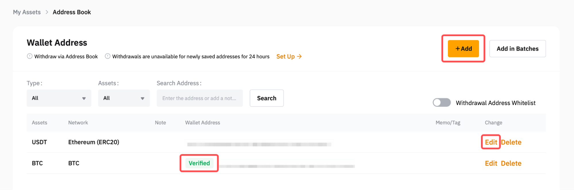 第 2 步: 請單擊頁面右上角的添加以添加新錢包地址,或單擊編輯選擇要驗證的錢包地址。