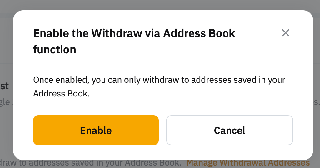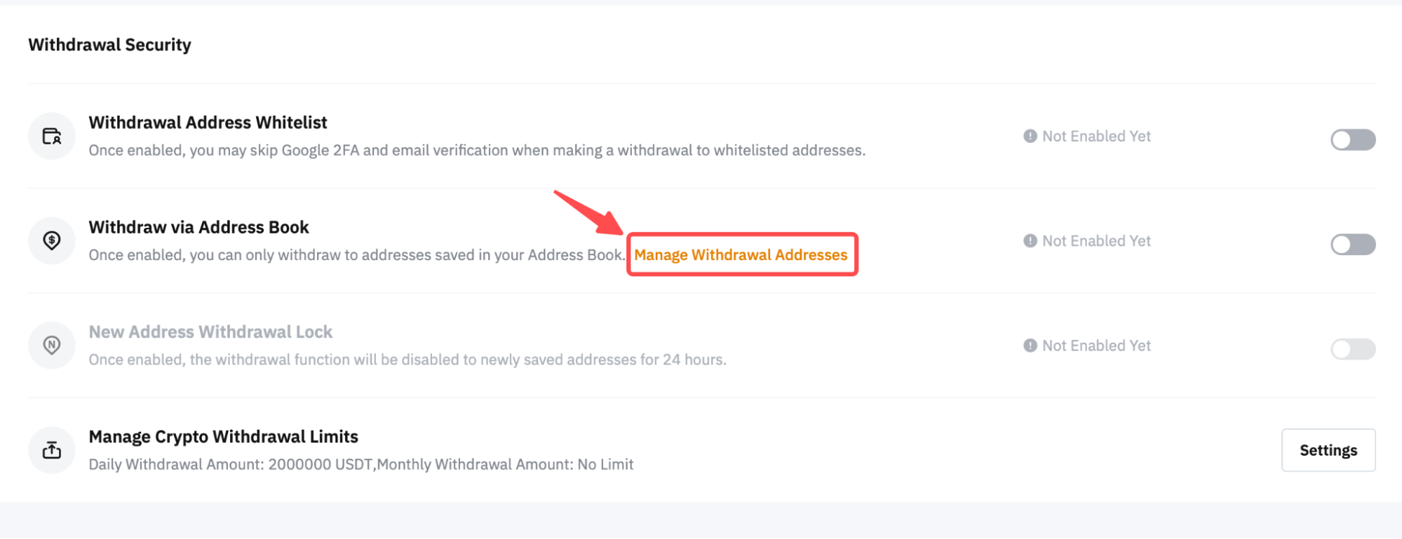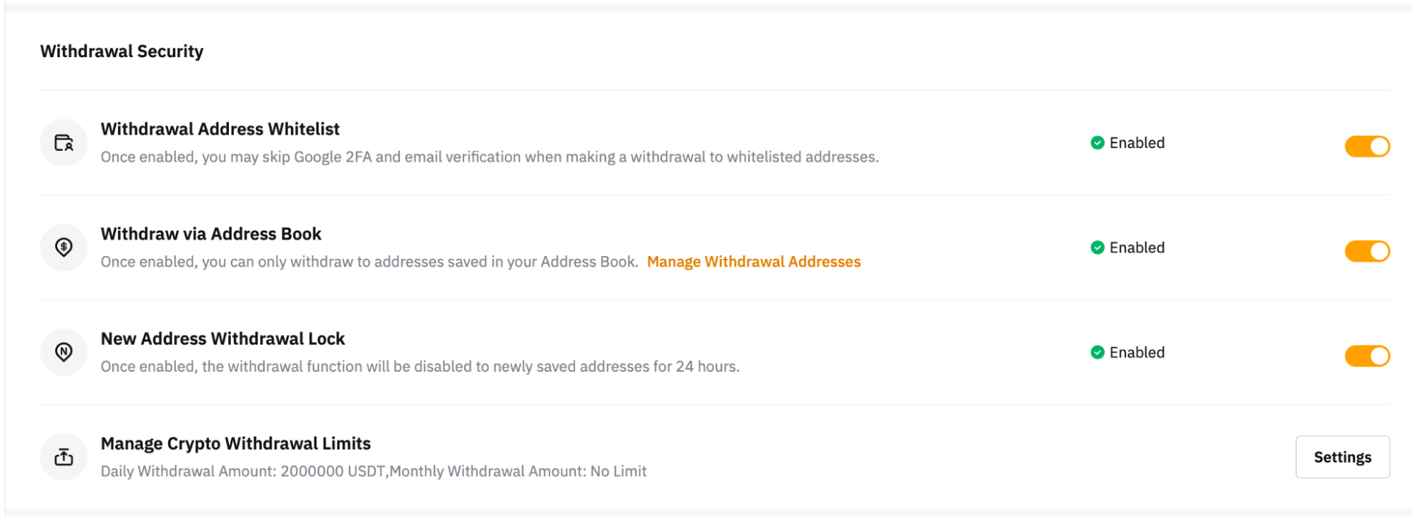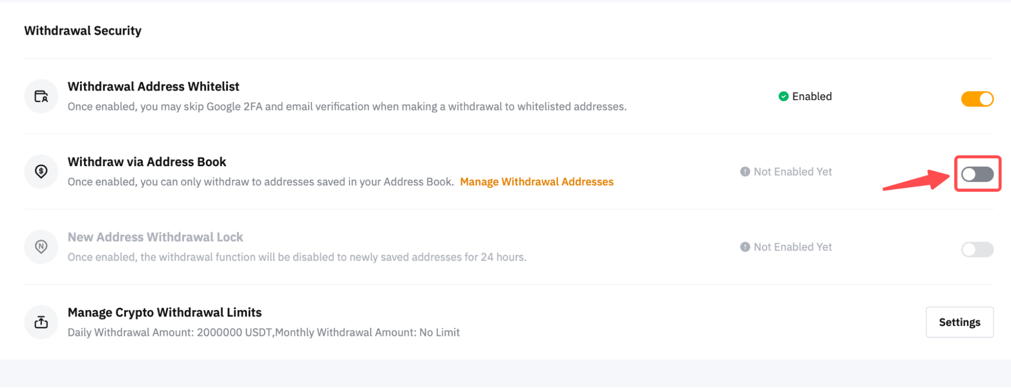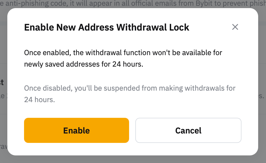 新地址提款鎖定功能將禁止提款添加到您的提款地址簿中的所有新錢包地址。 鎖定不會影響在功能激活前至少 24 小時添加的地址。