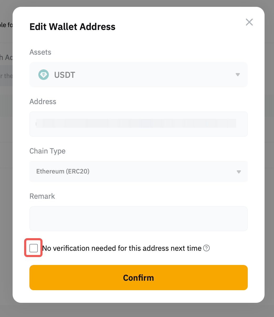 第 3 步: 爲您的提款錢包輸入正確的硬幣、區塊鏈和錢包地址信息,並勾選下次此地址不需要驗證選項。 完成後點擊確認。