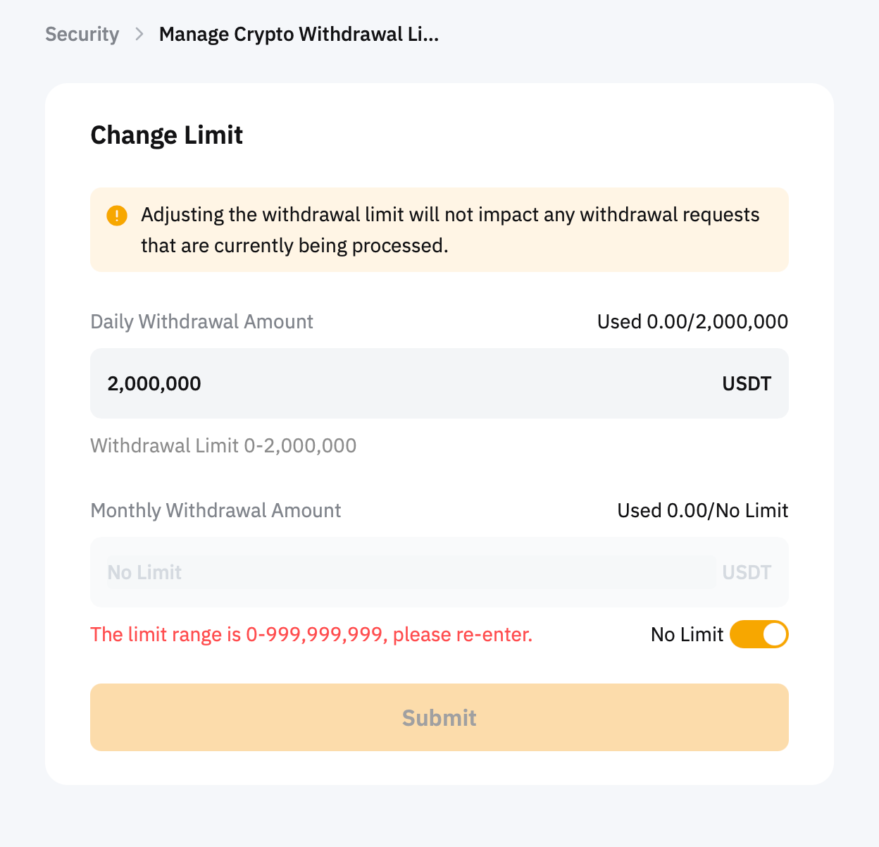 — 更改您的提款限額不會影響您當前的提款請求,並且僅對下一個提款請求有效。