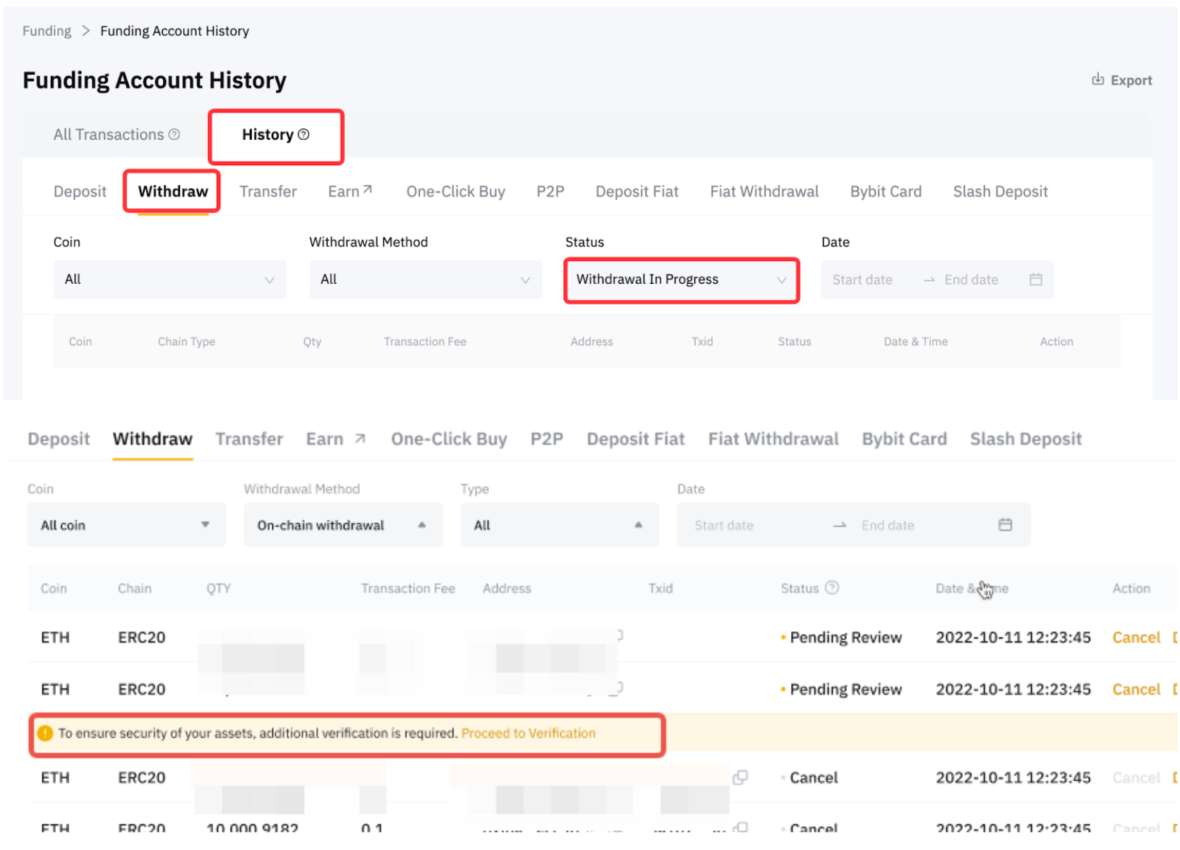 第 2 步:在狀態篩選欄中選擇提幣處理中,查找帶有「為保障您的資產安全,該筆提現需完成額外驗證。前往驗證」字樣的訂單,然後點擊前往驗證。