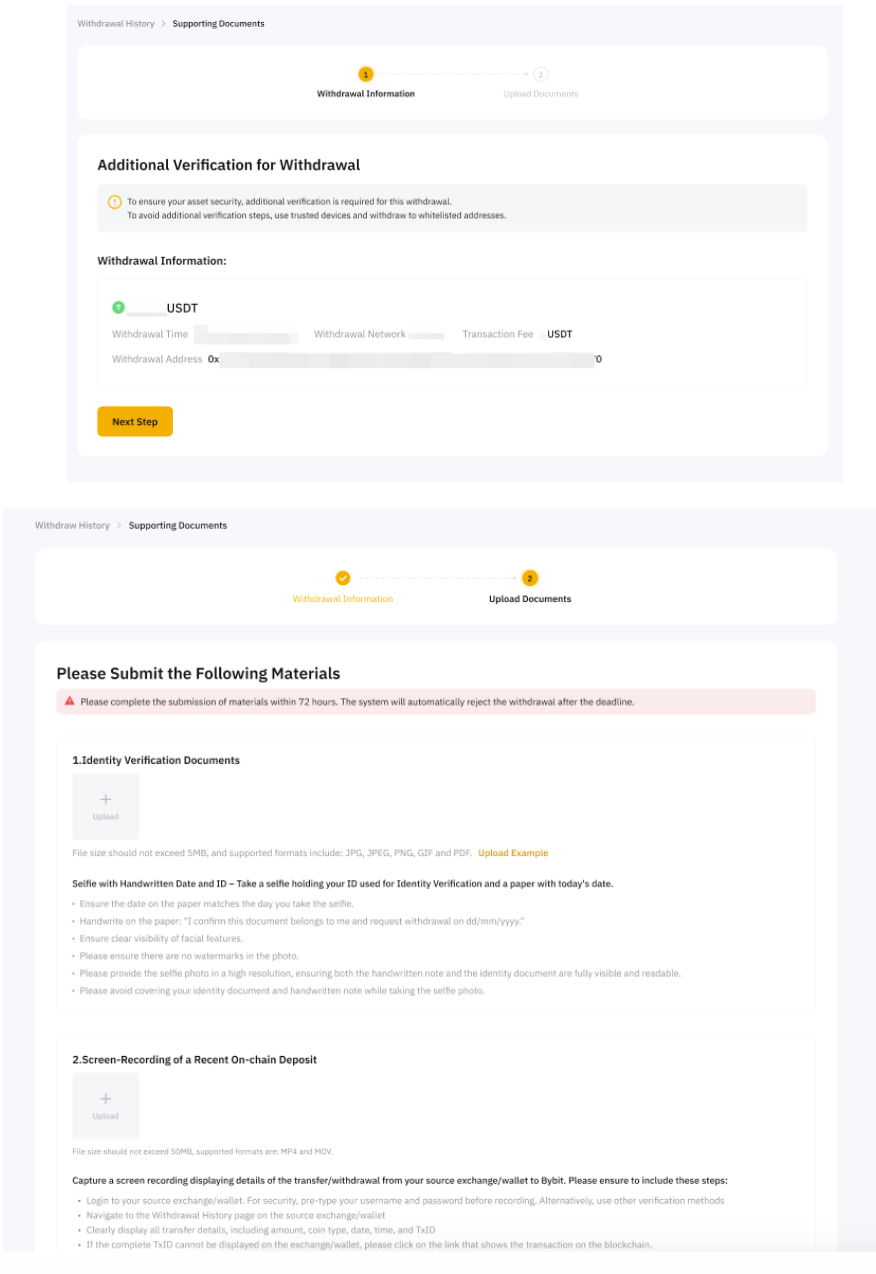 為確保資產安全,您可能需要在提幣過程中提交額外資料以完成身份認證。如果您未能在 72 小時內提供所需文件,您的即時提幣請求會被駁回。