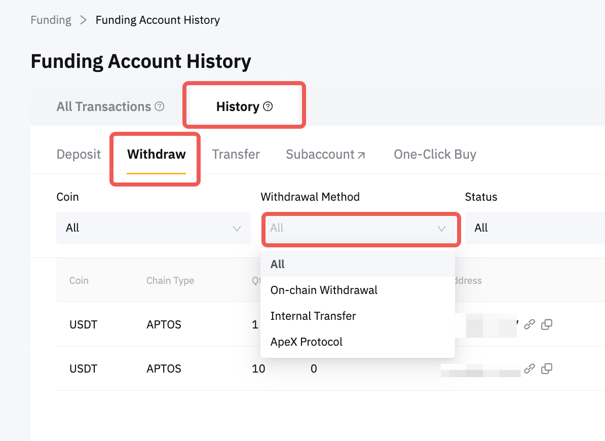 第 3 步前往歷史記錄提現並從提幣方式中選擇您用於取現的方式。