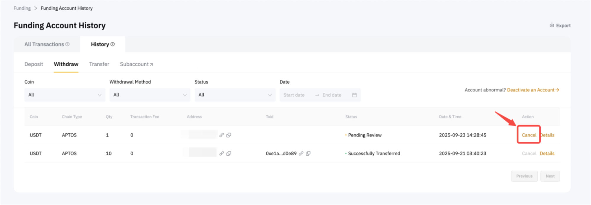第 4 步:選擇特定的提款請求,然後單擊頁面右側的取消。如果取消按鈕變灰,這意味著您不能取消您的提款請求,因為它已經在完成過程中。