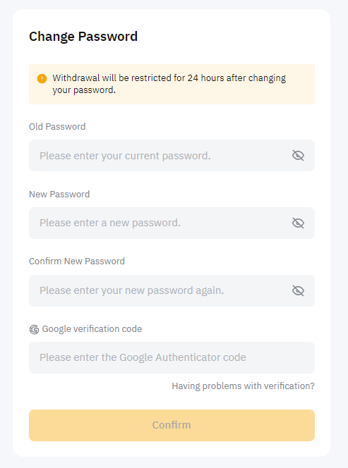 輸入您的舊密碼、新密碼以及您的Google驗證碼,然後點擊確認,密碼重設即生效。 作為安全措施,您將登出帳戶,需要使用新密碼重新登入。
