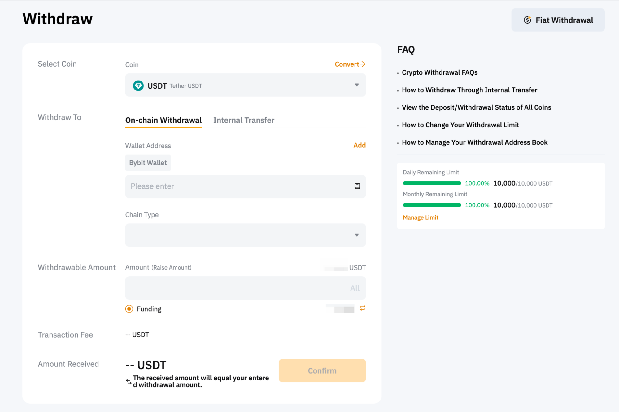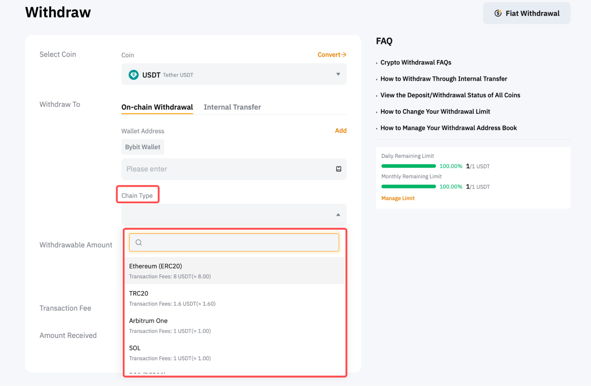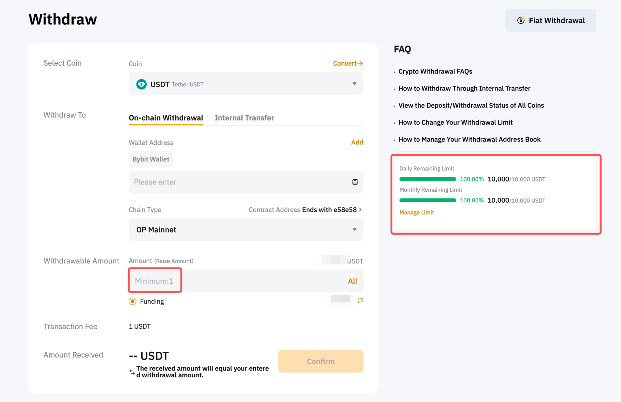 第 4 步:輸入要提幣的金額,或點選“全部”提幣所有相關貨幣。選擇鏈類型後,該特定代幣和區塊鏈網路的最低提幣限額將顯示在提幣金額欄位中。頁面右側還有每日和每月剩餘提幣限額。若要更改提幣限額,請遵循此處的指南。