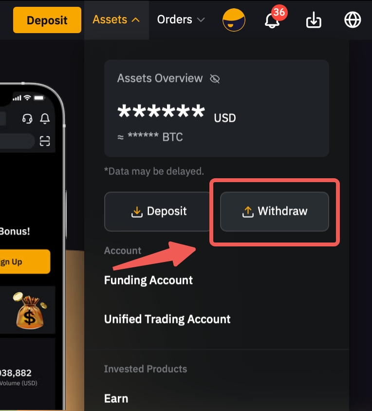 註:所有提幣只能透過資金帳戶進行。如果您在其他帳戶中有可提現資金,請先將資產轉入資金帳戶,然後繼續。