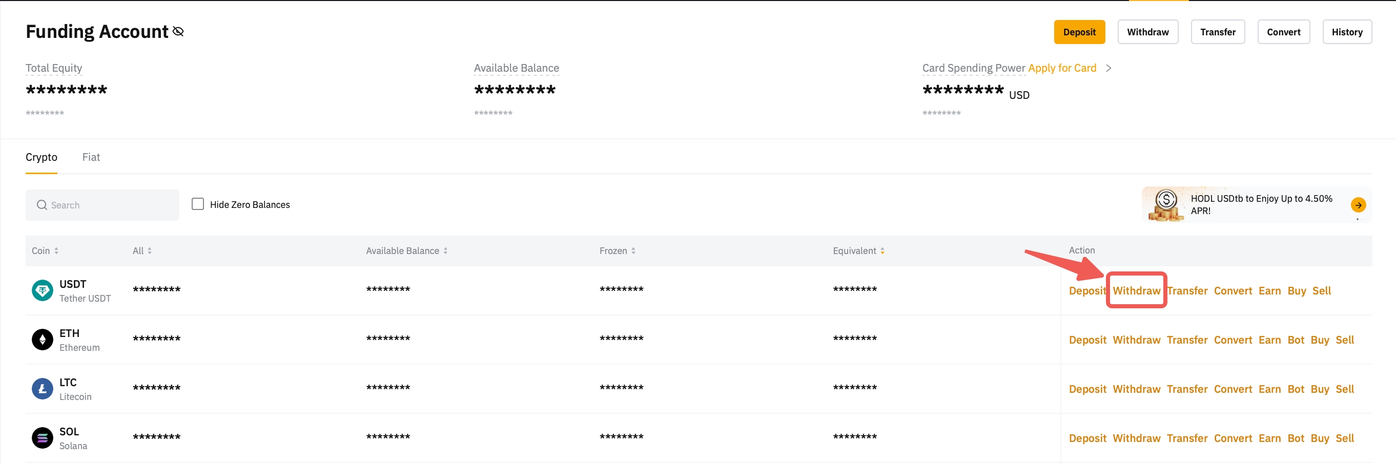 或者,前往資金帳戶,點擊您希望提幣的代幣欄中的提幣按鈕。