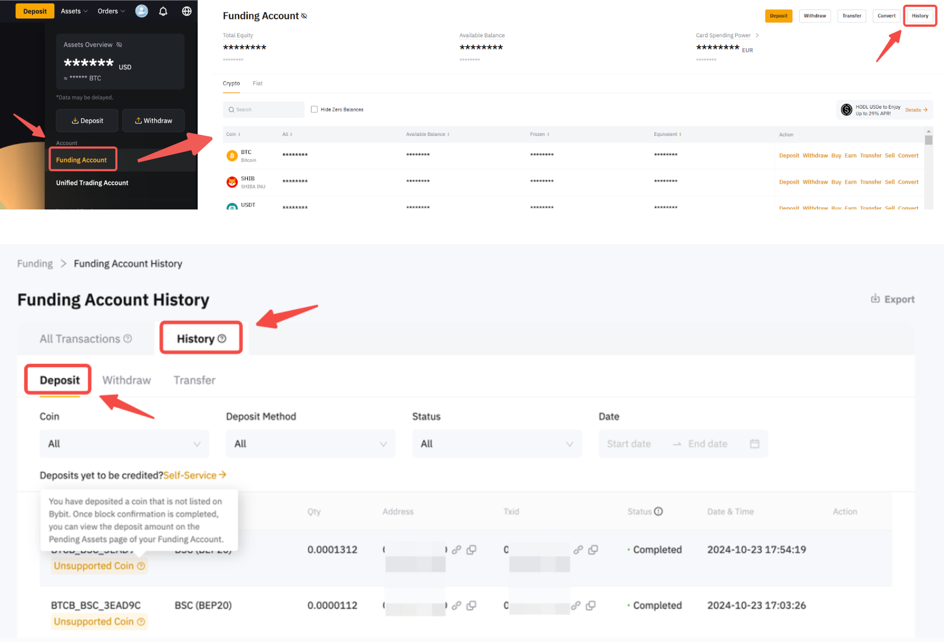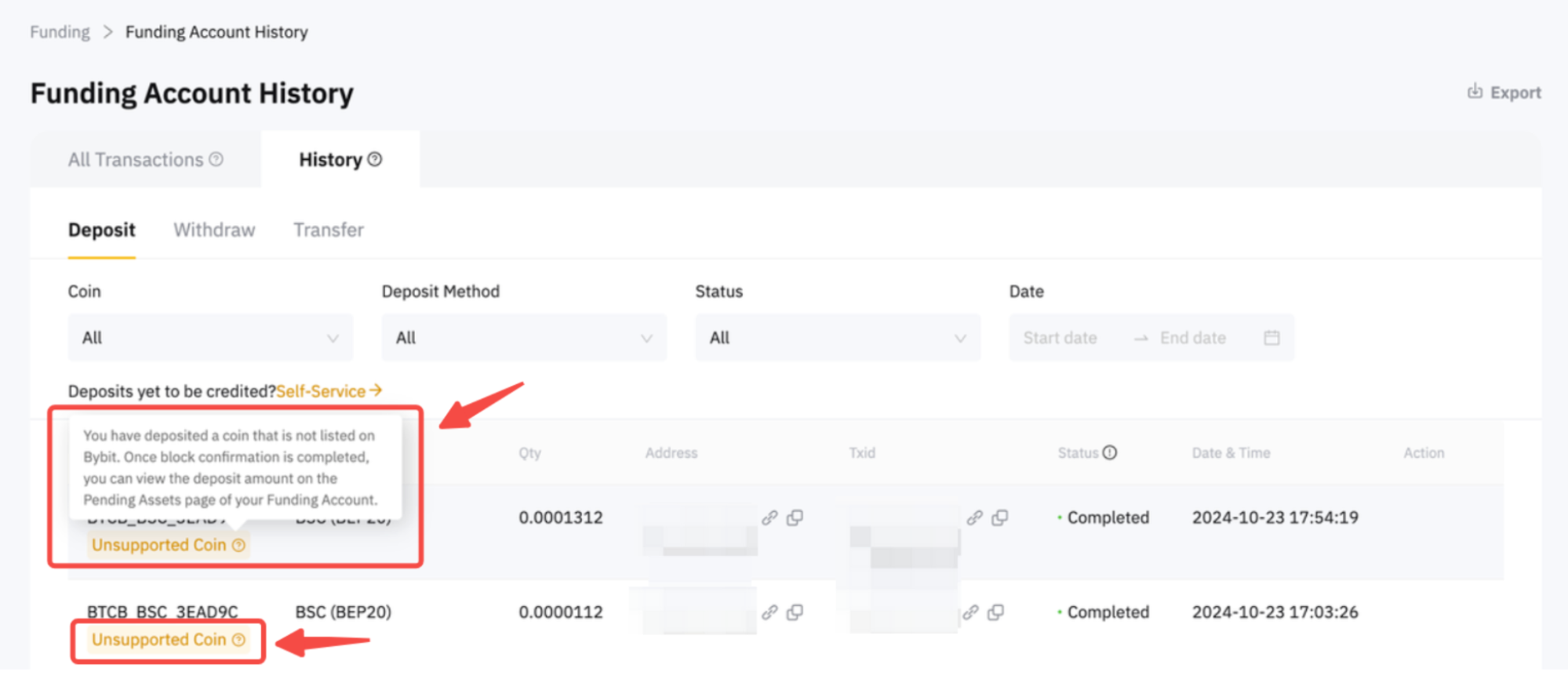 a. 如果您在儲值記錄中看到不支援的代幣記錄,請遵循下方的 A) 自助服務指南,即可發起提幣。