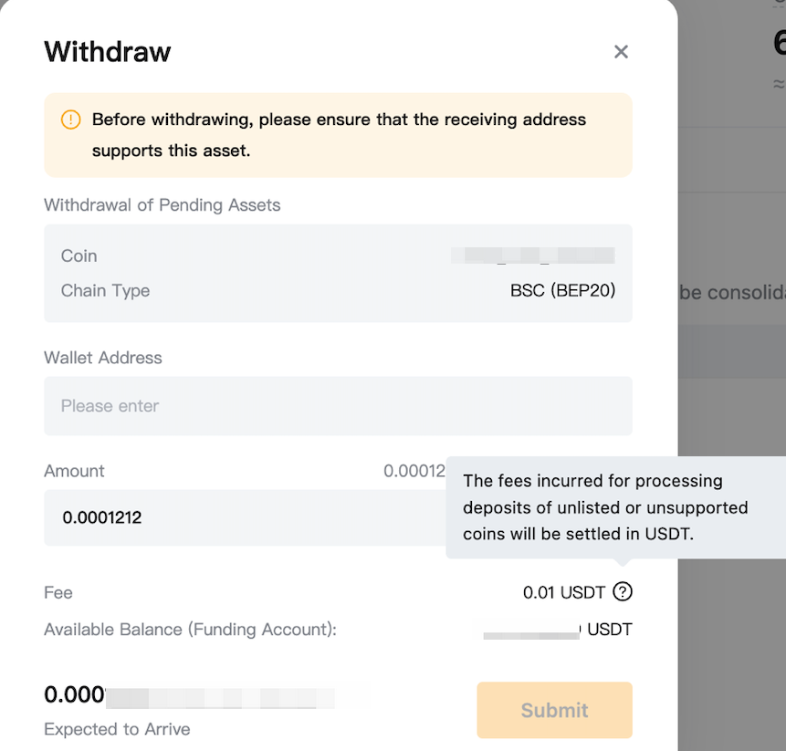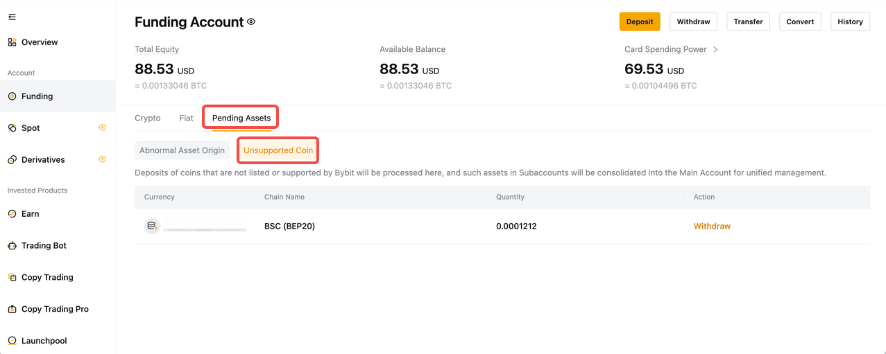 將不支持的資產從“待處理資產”頁面提幣至支援回收代幣和鏈的外部平台或錢包。
