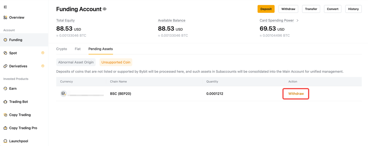 第 3 步:在“待處理資產”部分的“不支持的幣種”下,點選“操作”欄中的“提幣”。